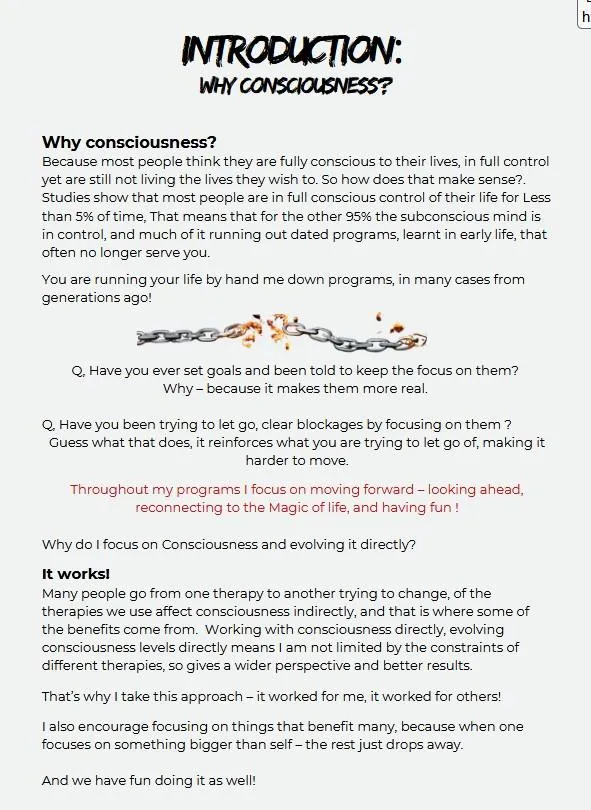 This ebook will bring into awareness the 'levels of consciousness' and what shows up in your life at different levels. It also explains how, by focusing on lifting your Level of Consciousness, you start to ascend to levels where life not only changes, but the rate of change accelerates.